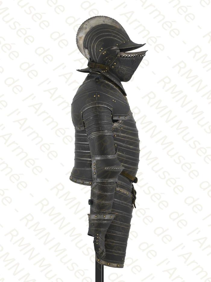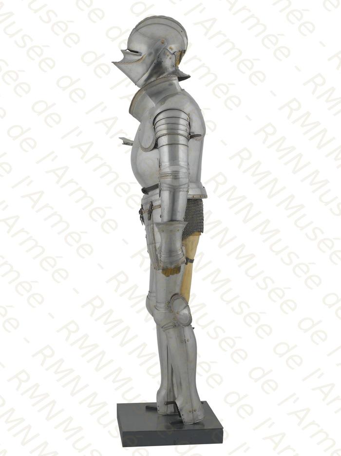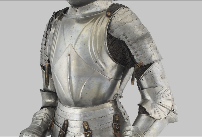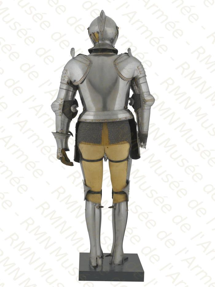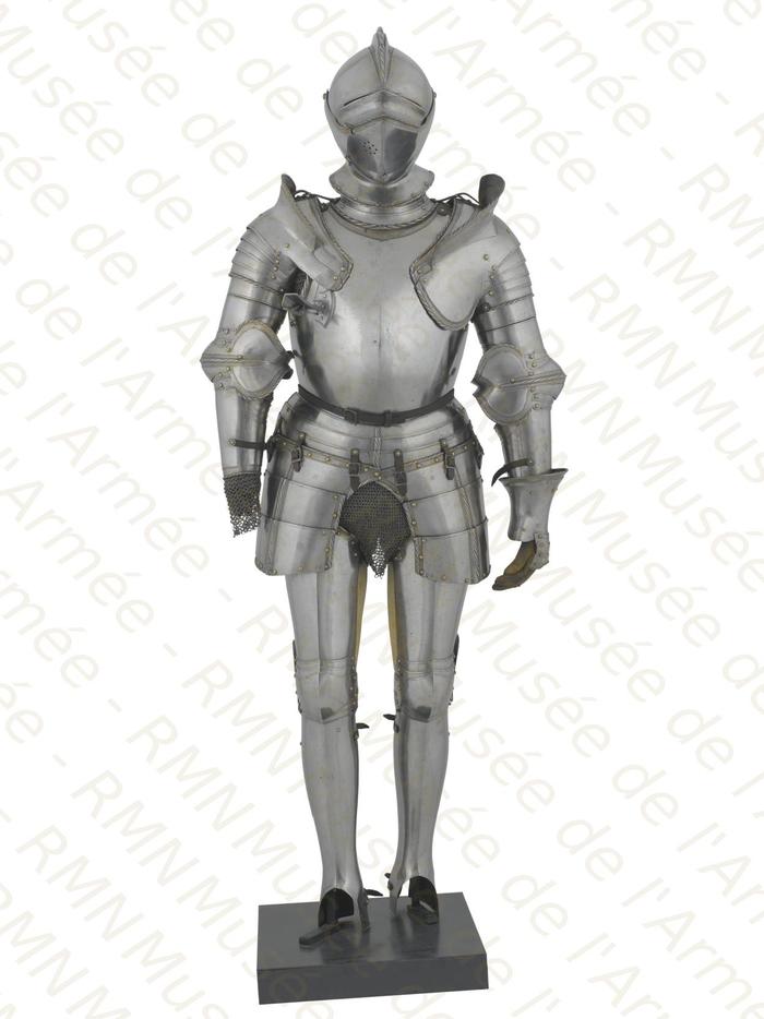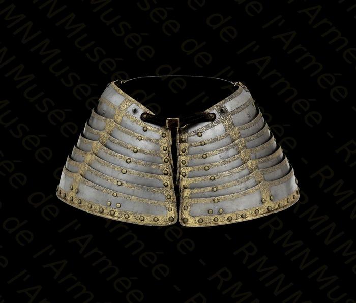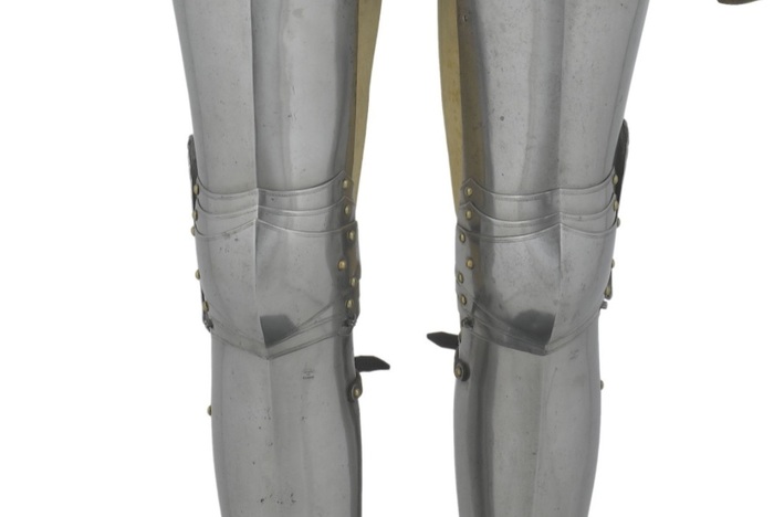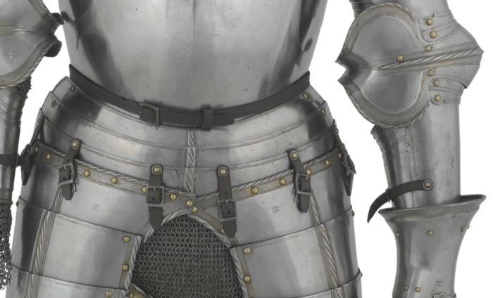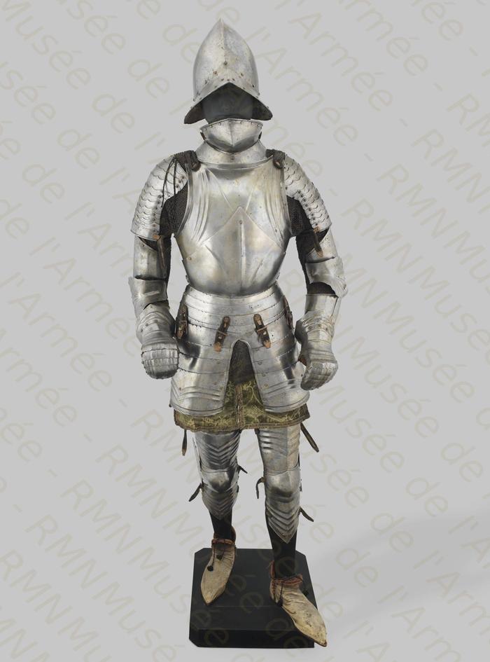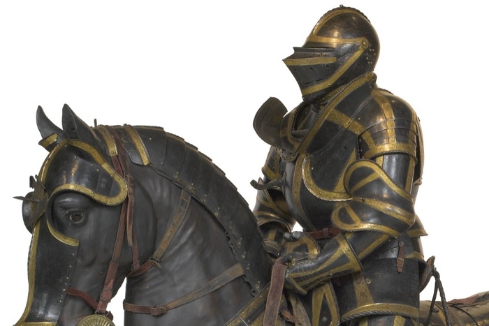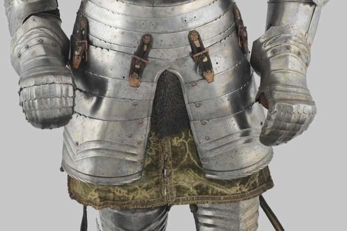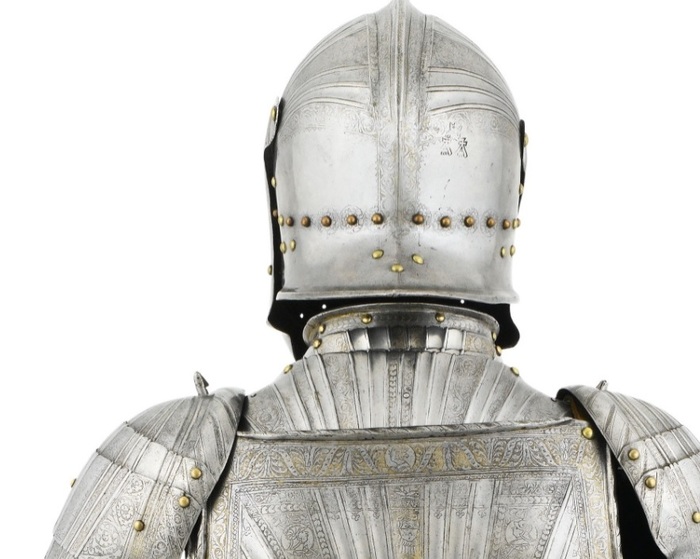 Перед нами доспех Филиппа II. Император Карл V заказал его в 1544 году как часть великолепного «Великого гарнитура» для своего сына Филиппа II Испанского. Доспех изготовили мастер Дезидериус Хельмшмидт и аугсбургский гравер Ульрих Хольцманн. Доспех очень тонко украшен широкими черными протравленными продольными полосами в виде узора из переплетенных завитков и листвы, который сопровождается узкими полосами, наведенными золотом. На доспехах выгравирована дата "1544". Известен как муж королевы Марии-католички, дочери Генриха VIII. После отречения отца в 1555 году, он стал его преемником в Нидерландах и Милане, а в 1556 году сделался королем Испании, Неаполя, Сицилии и «обеих Индий». В 1580 году он наконец-то стал еще и королем Португалии. Экспонируется доспех в зале №3. Изготовители: Дезидериус Хельмшмидт (1513 – 1579 гг, Аугсбург), Ульрих Хольцманн (травление) (в 1534 – 1562 гг, Аугсбург). Материалы и технологии: «белый металл», позолота, травление, чернь, латунь, кожа