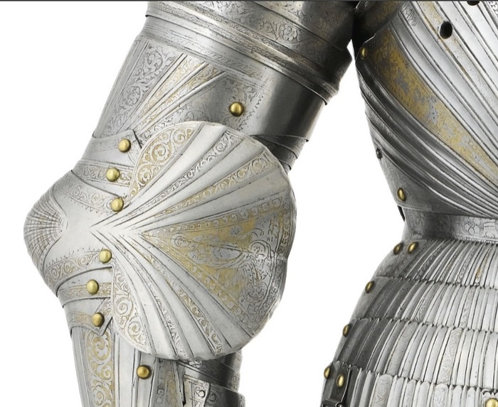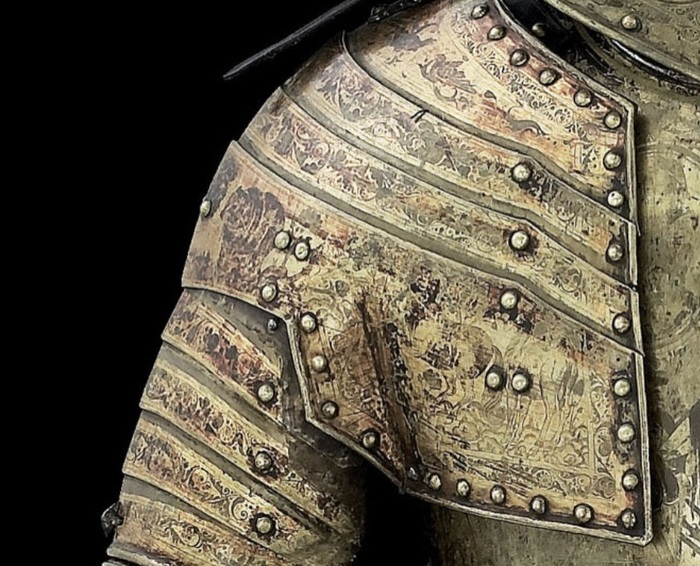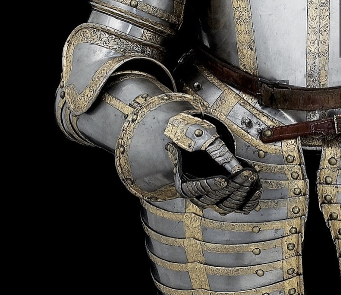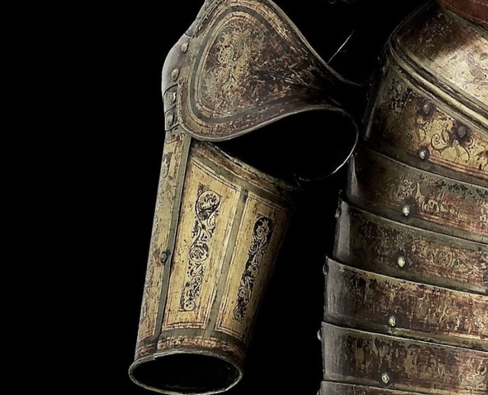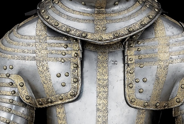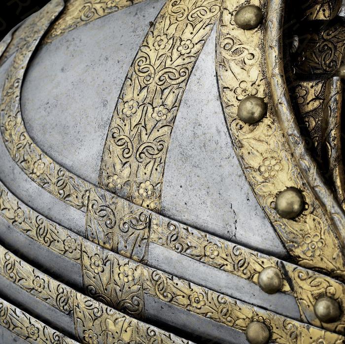 Самым простым способом превратить практически любые доспехи в парадные было их золочение. Применялись разные способы, но самым доступным было огневое золочение при помощи ртутной амальгамы. Золото растворяли в ртути, потом покрывали получившимся составом детали доспеха и нагревали. Золото прочно соединялось с железом, но пары ртути представляли немалую опасность для тех, кто применял этот метод. Кстати, очень красивые золоченые доспехи делал опять-таки миланский мастер Фиджино в 60-е годы XVI века. Другим способом золочения была плакировка: детали доспехов нагревали и покрывали золотой или серебряной фольгой, после чего разглаживали специальным «гладильником». Получалась прочное «золотое» покрытие. Причем, в Аугсбурге мастера применяли этот способ уже в 1510 году.