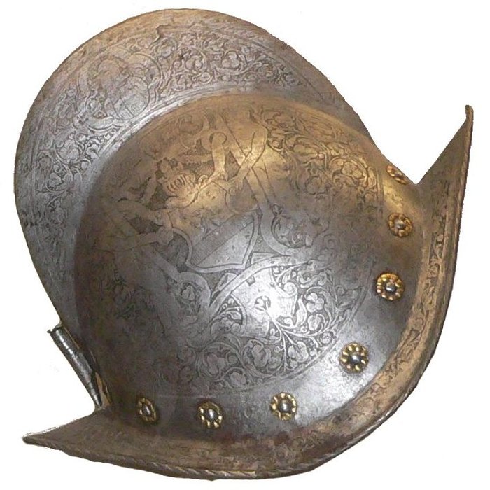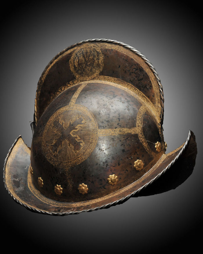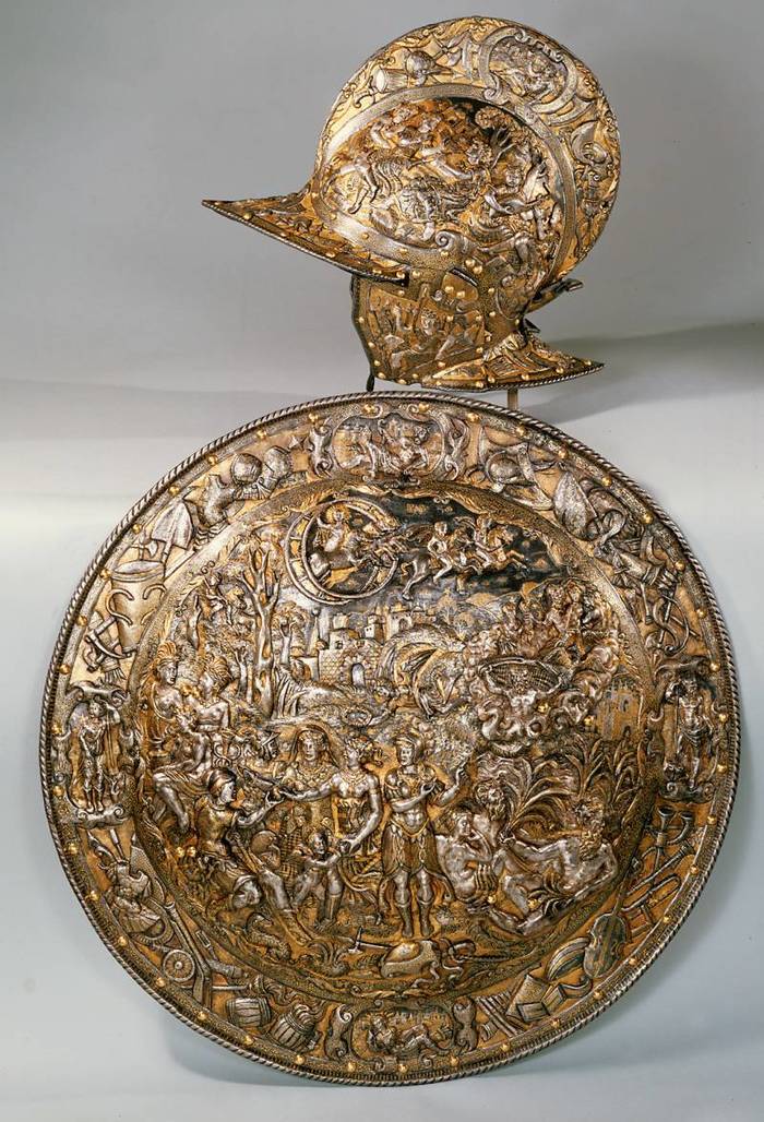 Бургиньот и щит из гарнитура в античном стиле. Изготовлены около 1560 года в Милане для Фердинанда II Тирольского. Стиль работы соответствует творчеству миланского оружейника Лусио Пиччино (около 1575 – 1595 гг., Милан). Материалы и технологии: полированная сталь, фольгированное серебрение и золочение, насечка золотом (в запаснике)