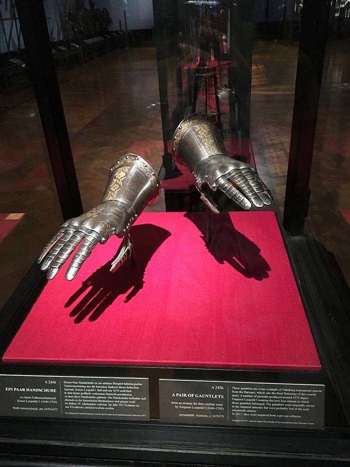 Сразу же после начала Тридцатилетней войны (1618-1648) эрцгерцог Леопольд V из Тироля приказал своему доспешнику Гансу Якобу Топфа из Инсбрука изготовить вот этот чрезвычайно тяжелый полудоспех, обеспечивший ему превосходную защиту во время осады в Шанцграбене. На нем есть следы от пуль: на шлеме, груди и спине, что подтверждает его высокие защитные качества. Но вот вес более 40 килограммов позволял находиться в нем даже тренированному человеку только в течение короткого времени. Экспонат находится в зале №8. Мастер-изготовитель: Ганс Якоб Топф (1605 – 1628 гг. Инсбрук). Материалы: железо синего воронения, сусальное золото, кожа, черный бархат
