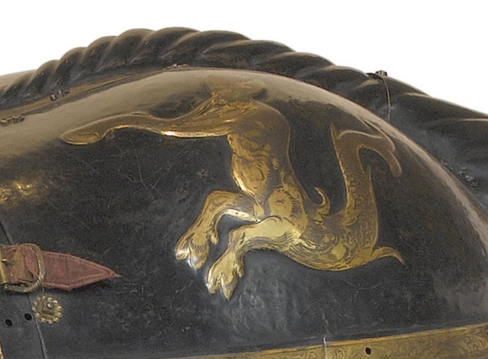 Парадные доспехи эрцгерцога Фердинанда II Тирольского (1529-1595). Были изготовлены по случаю свадьбы эрцгерцога Фердинанда II с Анной Катериной Гонзага в 1582 году (изображены в «Свадебном кодексе» Фердинанда II (инв. №: KK_5270). Записаны в инвентарной книге замка Амбрас (1596 г.). Открытый шлем бургиньот украшен драконом и покрыт изнутри оригинальной подкладкой из красного атласа. Наплечники в виде чеканных львиных голов, которые позолочены. Присутствуют декоративные элементы римских доспехов. В этих доспехах эрцгерцог Фердинанд мог вообразить себя, скажем, героем Троянской войны, или даже легендарным прародителем Рима Энеем. Мастер-изготовитель: Якоб Топф (1573 – 1597 гг. Инсбрук). Материалы и технологии: «белое железо», травление, позолота, чернь, медь, бархат, атлас, серебряная парча