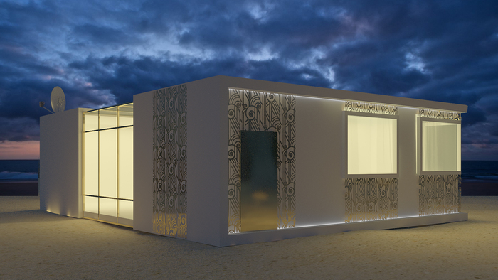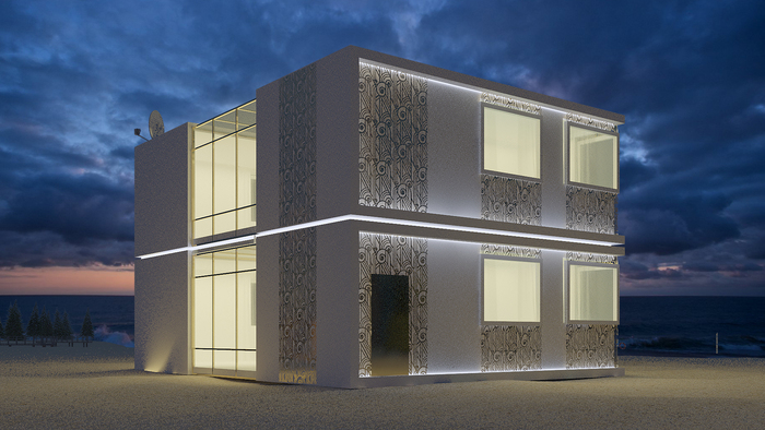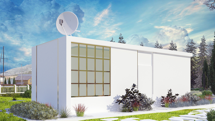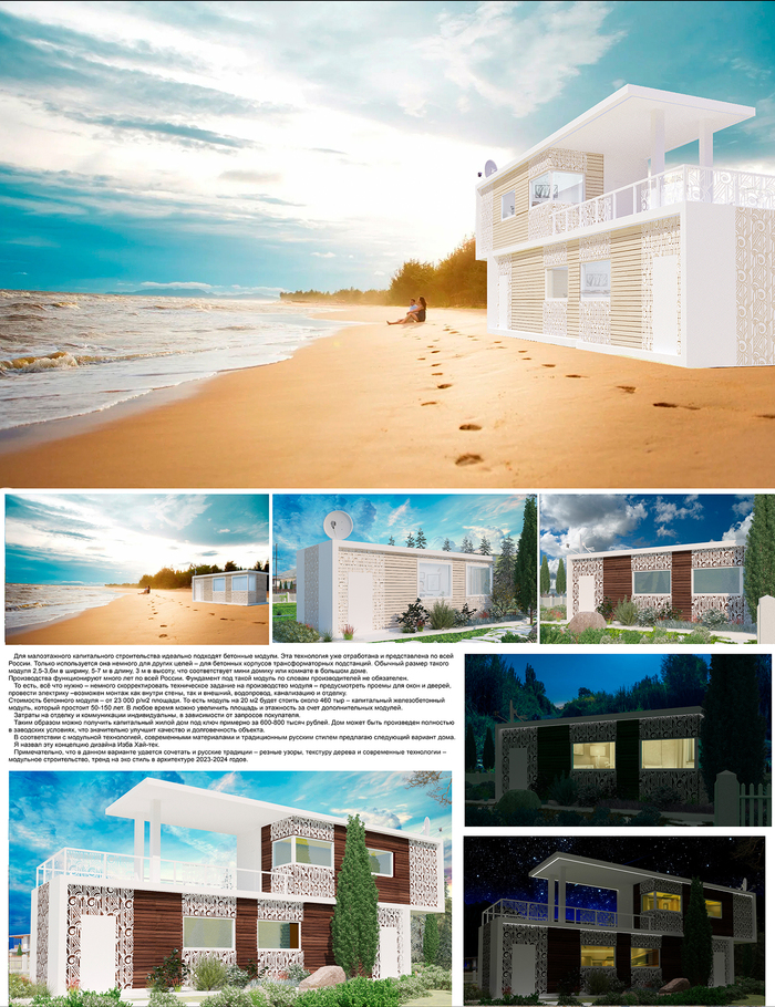 Но оно хорошо иллюстрирует предложенные в прошлых постах идеи по строительству модульного бетонного дома на основе бетонных корпусов трансформаторных подстанций - размер модулей примерно такой же, отверстия под окна и двери а также стены - всё это могут учесть при изготовлении.