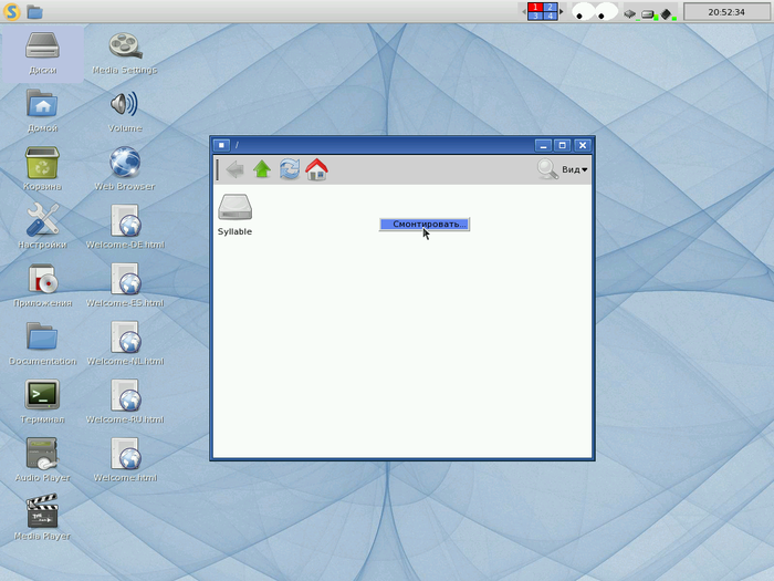 Проводник, если его можно так назвать, напоминает мне Windows 95 — файлы показывает, больше ничего там нет. Особенно доставил принцип подключения внешних носителей и дисков. Нужно открыть апплет «Диски», нажать по свободному пространству правой кнопкой мыши и выбрать пункт «Смонтировать», а далее найти своё диск из дерева устройств. Для меня ничего сложного, но непонятно, чего-бы не сделать автомонтирование. Впрочем, вспоминая прародителя Syllable AtheOS, можно сказать, что и это прорыв — терминал для монтирования дисков уже не нужен.