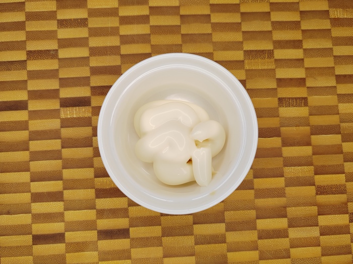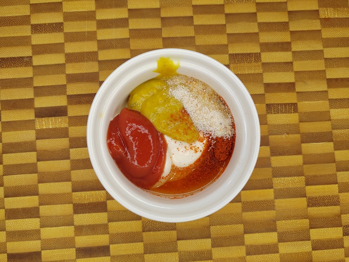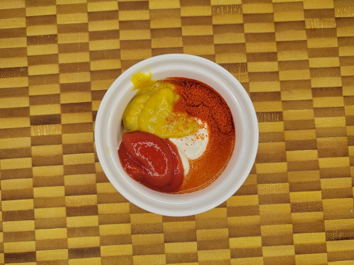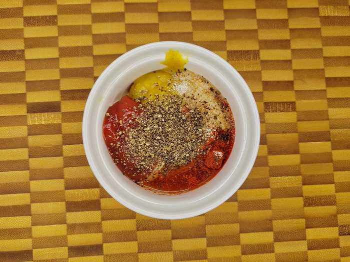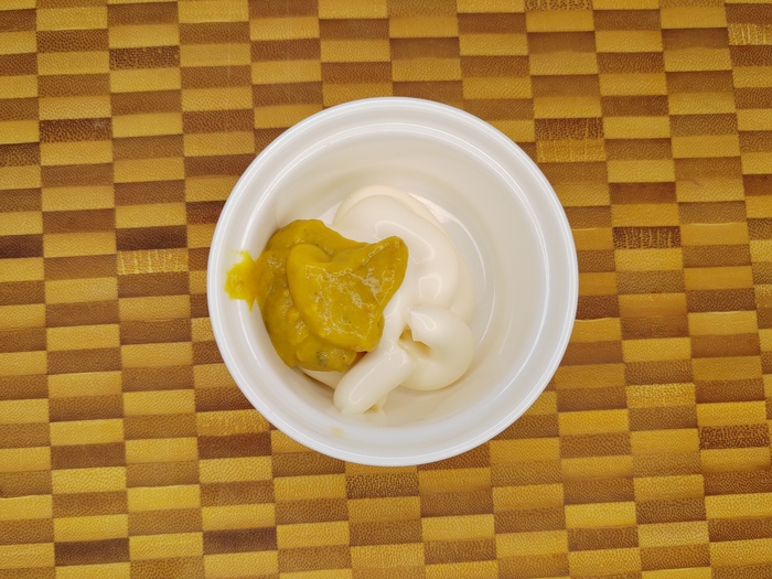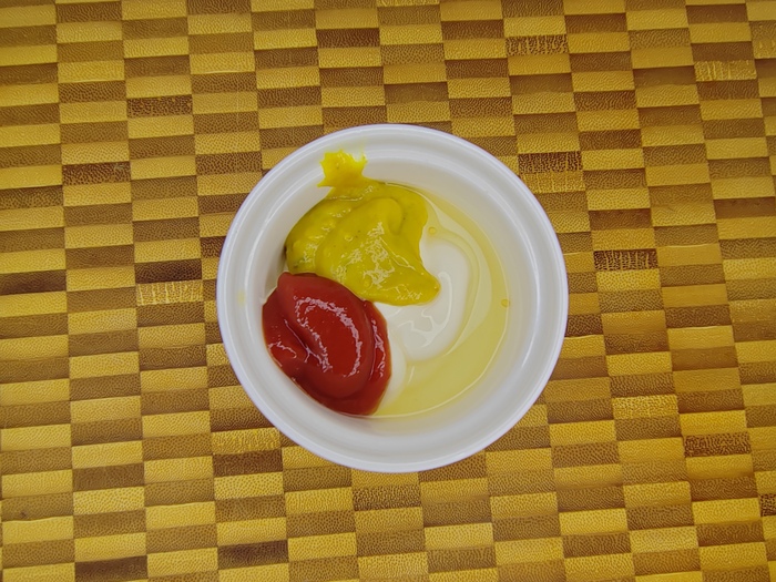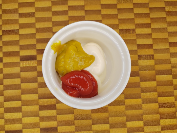 Соус - столовая ложка (25-30 г). Вообще один из классических соусов - это обычная неядрёная горчица, но я решил сделать бургер-соус посложнее.