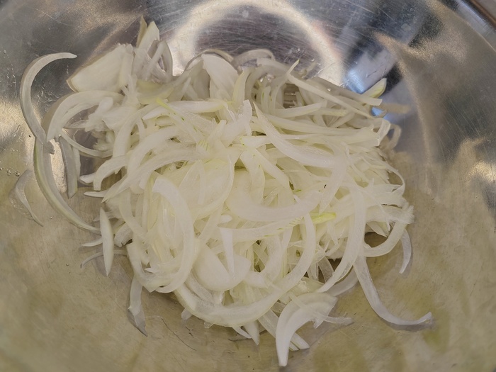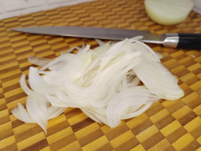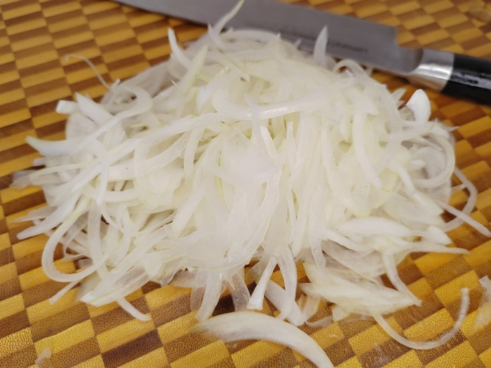 2. Тонко пошинкуем лук. Чем тоньше, тем лучше.