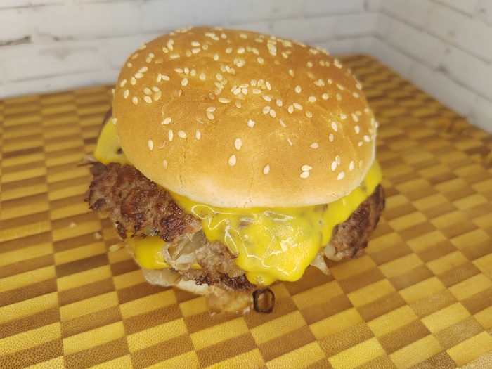 Вообще почему этот бургер депрессивный? Потому что появился он в двадцатых годах двадцатого же века, сиречь, во времена Великой депрессии, когда во время Великой железнодорожной стачки (забавно, кстати, насколько в США любят великие слова о великом величии вообще всего) хозяевами ресторана Hamburger Inn. Гомером и Россом Дэвисами было принято решение немного скраежопить и разбавить говяжий фарш более дешёвым луком, дабы накормить стачующихся железнодорожников. По пять центов за каждое "накормить".