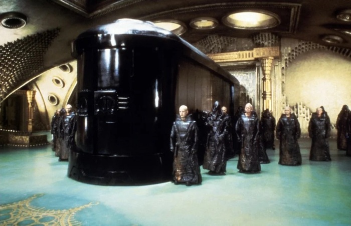 И тут, наша камера делает волшебный монтаж и переносит нас во дворец, к Алии. Когда Джессика, сыграв свою роль в событиях первой книжки, помахала всем ручкой и сдрыстнула с ненавистного помойного Аррахиса на любимый живописный Калладан, дабы валяться там на шезлонге, пить экзотические коктейли и выкладывать в инсте философские цитаты под фотками своей задницы, Алия взяла на себя должность главбабки. Оно и понятно, внутри Алии сидела генетическая память всех главбабок, да и самой Джессики впридачу. За 12 лет Алия преобразовала мессианскую религию фрименов в тоталитарный модернистский культ. Ее усилиями, фримены окончательно убедились в избранности Мойдодыра и брали приступом сами небеса во имя его улыбки.