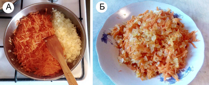 2. Разогреваем немного подсолнечного масла на сковороде, обжариваем лук. Когда лук уменьшится в объёме, сдвигаем его в сторону, доливаем при необходимости масло и там же обжариваем морковь. Когда морковь станет мягче (это видно), перемешиваем её с луком и тушим их вместе минут 5. После этого убираем на время в сторону (в тарелку). Где-то здесь нужно включить духовку)
