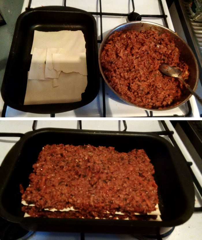 4. Собираем лазанью. На дно формы (моя 18*25 см) выкладывает пластинки. Идеально их класть не обязательно, все равно не чувствуется, целая пластина или ломаная. Важно оставить место у краев, лазанья имеет свойство расползаться. На пластинки выкладывает слой мяса, на него снова пластинки. У меня получается 3 слоя пластинок и 3 слоя мяса. Слоёв может быть сколько угодно, но верхний должен быть мясным
