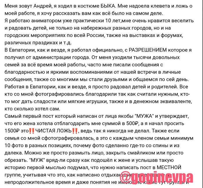 Разве это не обязанность евпаторийских чиновников - создать условия для организации интересного увлекательного досуга и развлечений с детьми и взрослыми по заранее обговоренному таймингу, содержанию, сценарию и стоимости? Разве не они должны провести тендер на закупку услуг аниматоров, проведение детских и семейных праздников и театрализованных представлений в Евпатории и контролировать их работу? В Евпатории работает театр на ходулях. Они выдают чеки, ни к кому не пристают, деньги не вымогают?