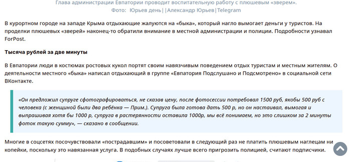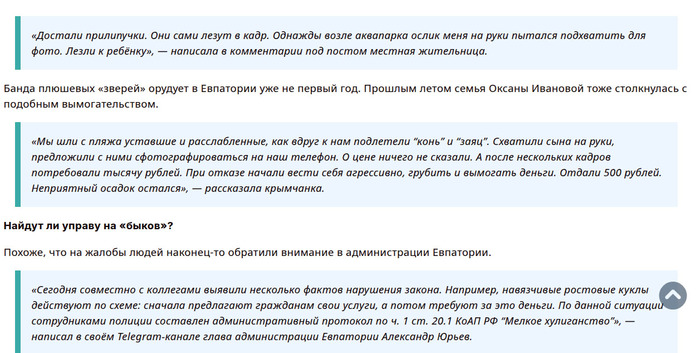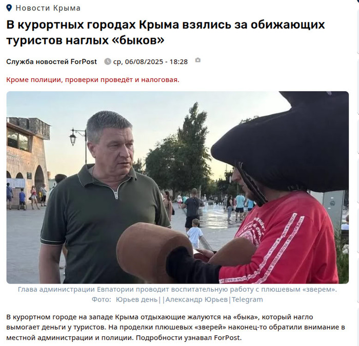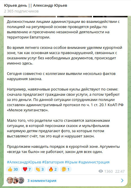 А разве в центре Санкт-Петербурга и в многих российских городах не работают ежедневно аниматоры? Почему же другие российские чиновники не устраивают такие безобразные шоу, не присваивают себе полномочия полиции, не занимаются, скорее всего, самоуправством, превышением должностных полномочий и нелегитимным насилием? Пусть сначала в культурной столице чиновники научатся решать эту проблему, а потом уже и в Евпатории смогут брать с них пример!