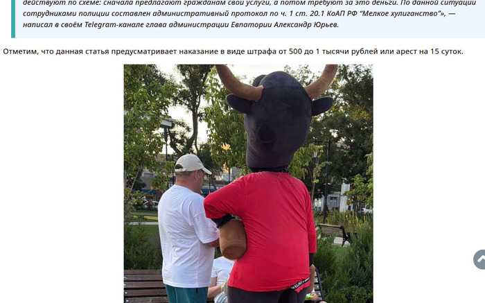 Сколько было оформлено протоколов не за оскорбление матом чиновников, а за незаконную предпринимательскую деятельность? Налогами должна заниматься налоговая служба, права потребителей должен защищать Роспотребнадзор, с мелким хулиганством и другими преступлениями должны бороться сотрудники полиции! Почему евпаторийские чиновники должны заниматься все этими вопросами? Могу и чиновники разгуливать по Евпатории в майках? Почему у них не было повязок и удостоверений членов "Добровольной народной дружины"? Завтра они будут наводить порядок в Евпатории в плавках и пляжных тапках - вот такие вопросы до сих пор задают отдельные несознательные пьяные и очень токсичные муниципальные тролли, защитники якобы пьяного евпаторийского быка-астматика!