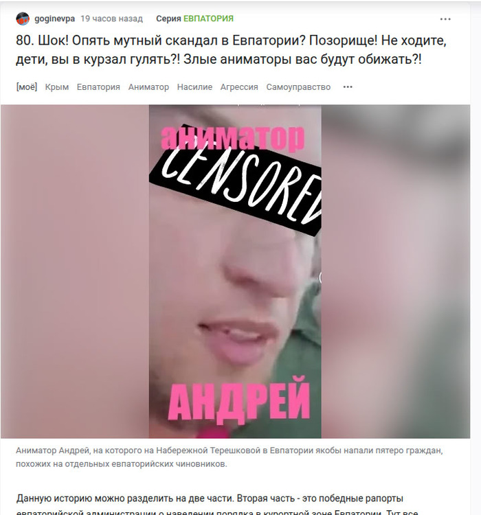 Это для Александра Юрьева аниматоры - это назойливые мошенники, а для меня все они - мои соседи, евпаторийские избиратели, у которых есть родители, братья, сестры, друзья, дети! И они имеют право потребовать создания новых рабочих мест с достойной оплатой! Отдыхающие приезжают и уезжают, мы даже их лиц не успеваем запомнить! Мы живем, как на вокзале, постоянно кого-то встречаем и провожаем! А зимой мы остаемся в Евпатории одни, без отдыхающих, без всей этой суеты. И мы должны помогать друг другу, потому что мы - соседи!