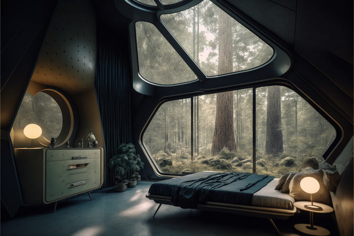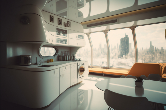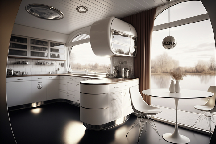 Хочу Вам показать ещё несколько вариантов ретро футуристического жилища, теперь в более современной цветовой гамме, на мой взгляд традиционные для ретро футуризма пастельные тона хорошо выглядят на картинке, но постоянно жить в такой мимимишной обстановке довольно тяжело)