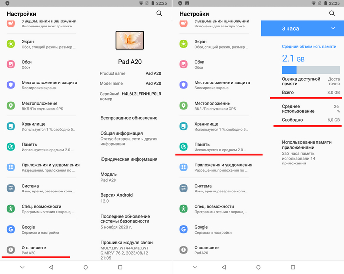 В настройках системы нигде не указано, какой SoC (процессор) установлен в планшете. Есть лишь информация об объеме оперативной памяти.
