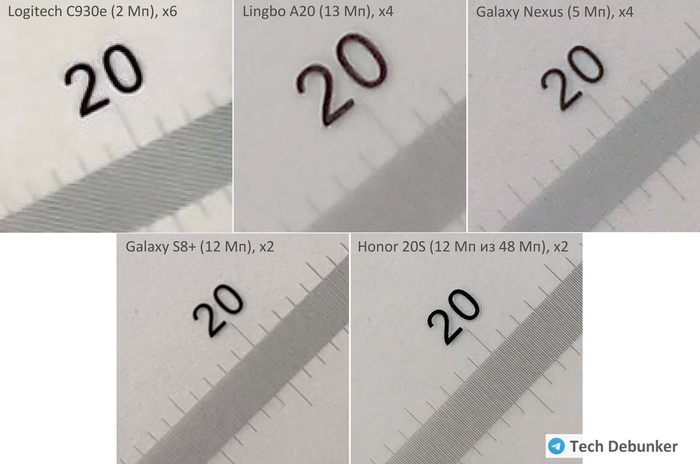В отсутствии под рукой качественных мир, решил пойти путем сравнения снимков Lingbo A20 с другими камерами известного разрешения. Фотографировал линейку от микроскопа, положенную под некоторым углом. Затем смотрел, камеры с каким разрешением позволяют увидеть деления 0,1 мм и не сливают их в кашу.