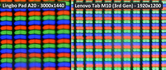 Справа для сравнения матрица 10-дюймового планшета Lenovo Tab M10 (3rd Gen) с разрешением 1920х1200. По числу пикселей, попавших в одну длину (15 и 22 соответственно), получаем у Lingbo те же ~1280х800 точек.