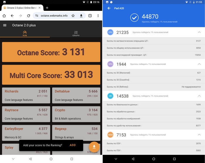 Ну и для справки несколько скриншотов других тестов (браузерный Octane, AnTuTu 7 и GFXBench), которые удалось прогнать на Lingbo Pad A20. Кому нужно – могут сравнить со своими смартфонами/планшетами или любыми другими.