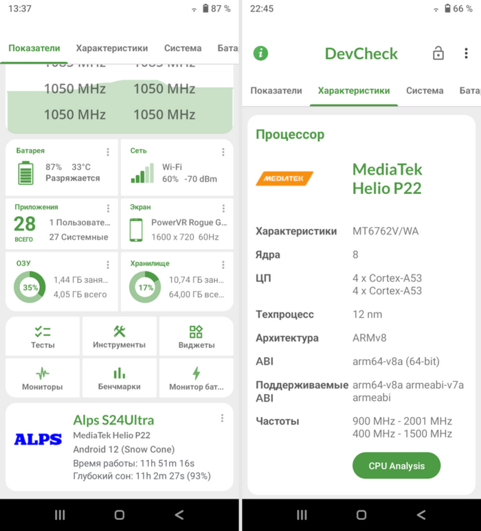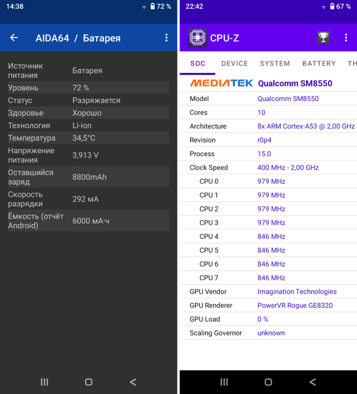 А вот с SoC появляются несостыковки. Оба приложения пишут, что в системе установлен некий MTK6799. Такого чипа в природе нет, но есть MT6799, более известный как MediaTek Helio X30 родом из 2017 года. У него 10 ядер: два ARM Cortex-A73 2,6 ГГц, четыре Cortex-A53 2,2 ГГц и четыре Cortex-A35 1,9 ГГц.