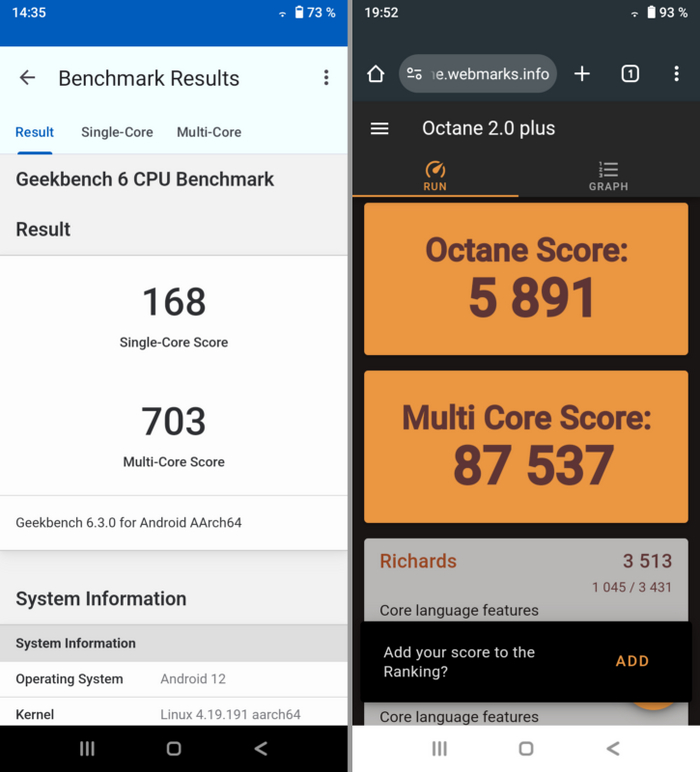 Для сравнения приведу результаты тестов планшета за 8,5 тыс. руб. одного отечественного бренда с чипом Unisoc Tiger T310 (1 ядро Cortex-A75 2,0 ГГц, 3 ядра Cortex-A55 1,8 ГГц), 4 ГБ ОЗУ и 64 ГБ накопителя – 440 / 820. Он в ТРИ раза шустрее. За те же деньги.