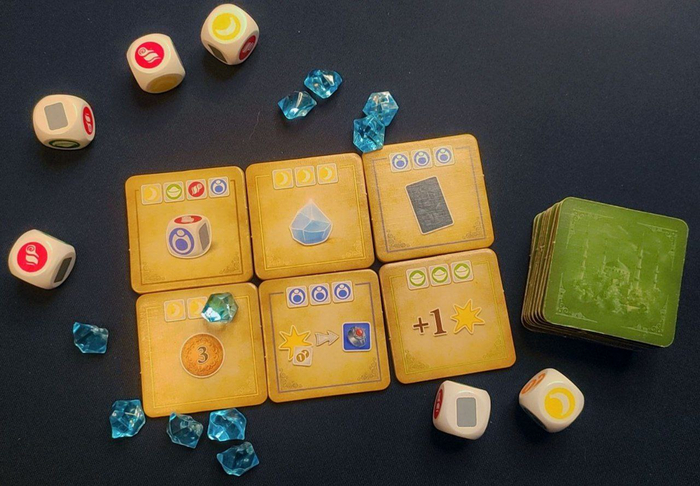 Итак, в игровую зону в случайном порядке выкладывается два ряда карт - по 5 в каждом. Делятся карты по цветам на три вида: