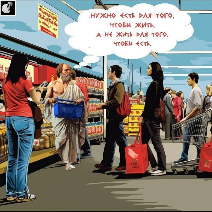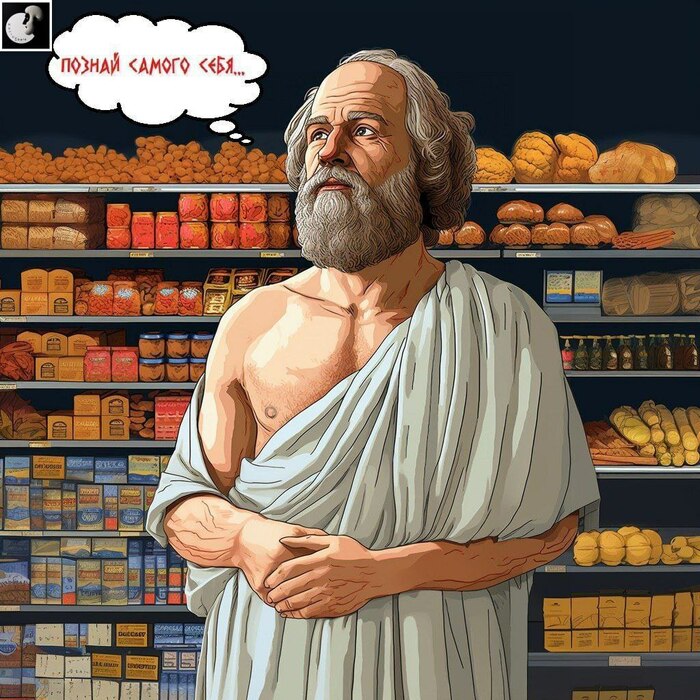 От изобилия еды в супермаркете у Сократа голова пошла кругом, но стойкий философ, познав самого себя среди полок с товарами, сумел вовремя обуздать инстинкты, свойственные обычным людям, и, оставшись верным своим принципам, прямо в супермаркете стал просвещать охочую до еды очередь в кассу. Очевидно, что Сократа вечером ждёт очередная житейская взбучка от Ксантиппы.