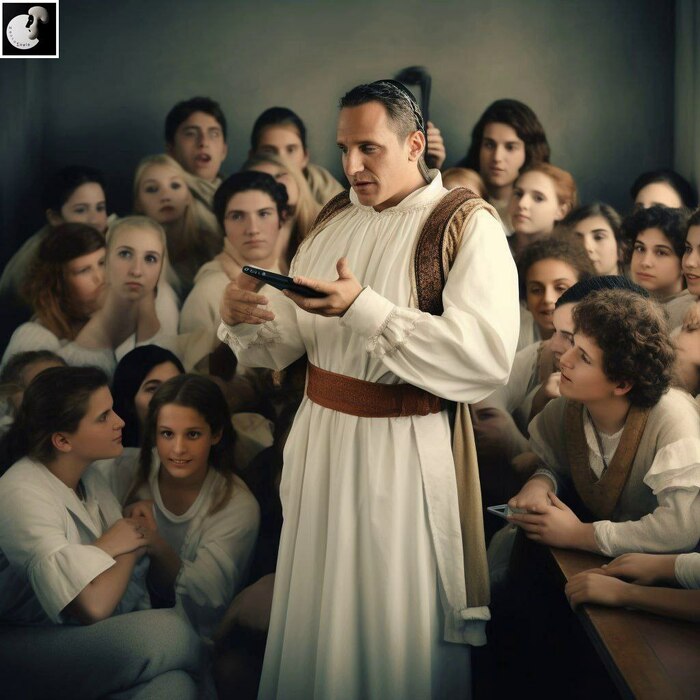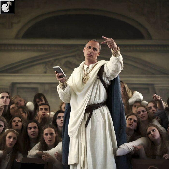 Представили, что древнегреческий философ Сократ со своей женой Ксантиппой, оставшейся в истории ярким примером вздорного характера, попал в наше время, и Ксантиппа, поражённая изобилием всяческих товаров, тут же послала философа в магазин закупиться всем чем можно. Философ, оторванный от своего любимого дела, кое, по мнению его жены, являлось лишь пустым праздношатанием в толпе среди таких же бездельников, однако сразу же побежал исполнять просьбу молодой жены.