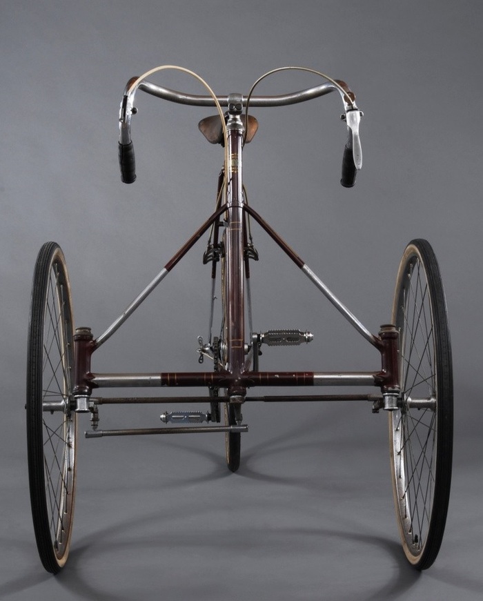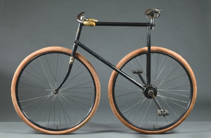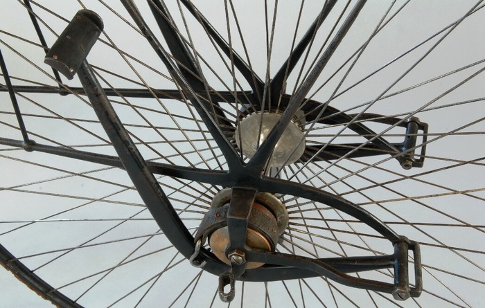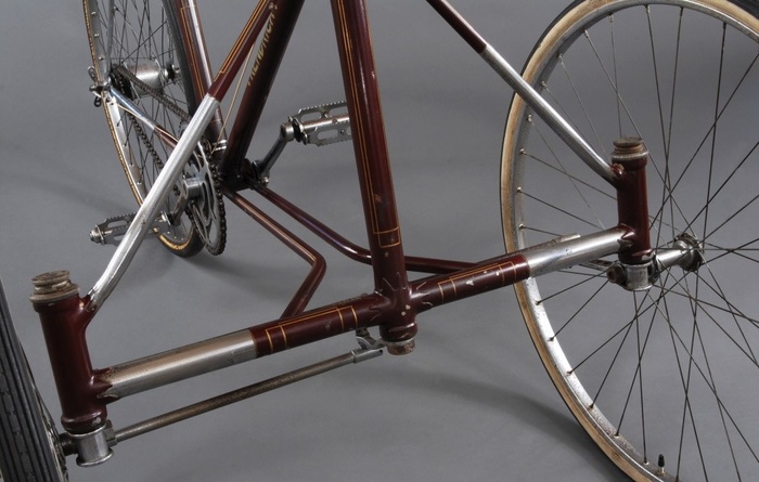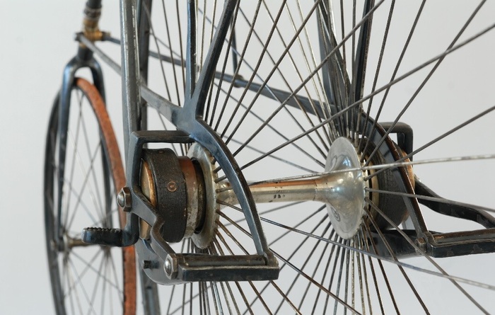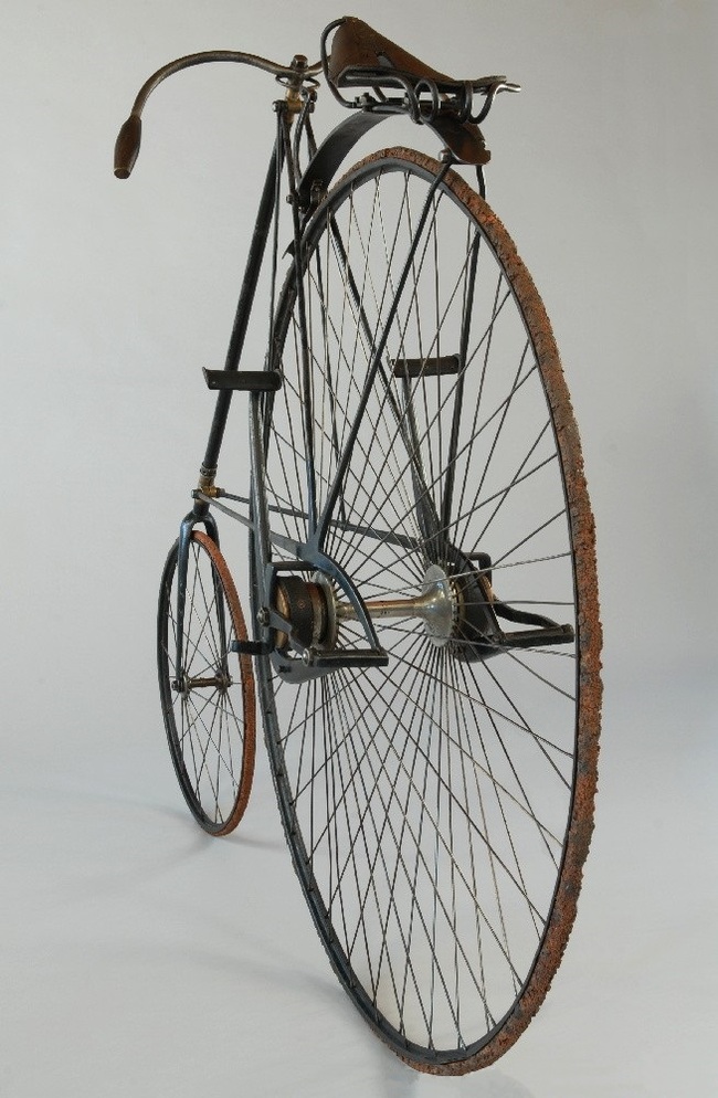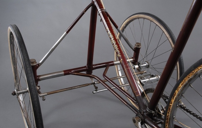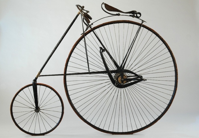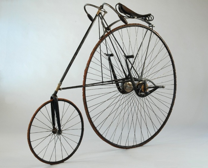 Редкий велосипед American Star производства H. B. Smith Machine Company 1880 года, с рычажным приводом. "Американская звезда" отличался от других обычных велосипедов того времени тем, что большое колесо было смещено назад для лучшей стабильности и повышения безопасности велосипедиста. У велосипеда также было преимущество - на нем можно было ездить очень быстро, так как можно было нажимать на педали обеими ногами одновременно, что было преимуществом при подъеме на холмы и на старте в гонках.