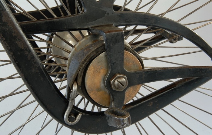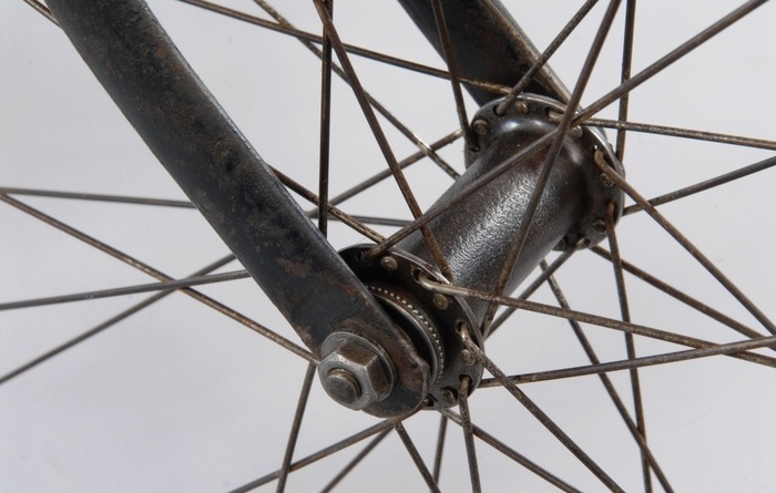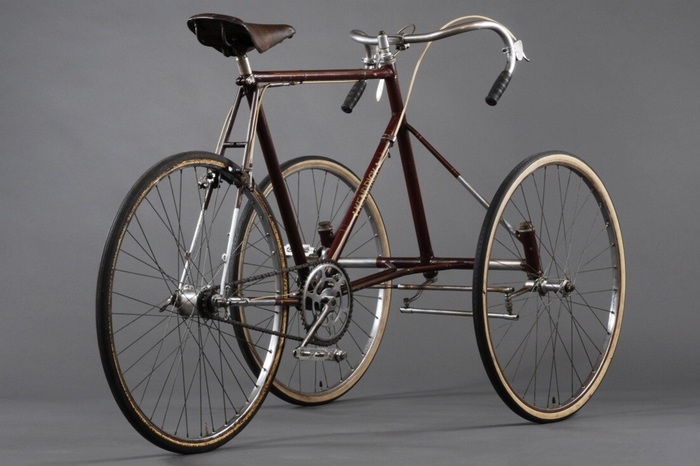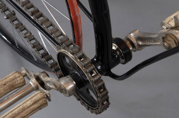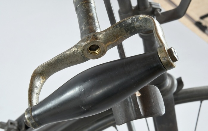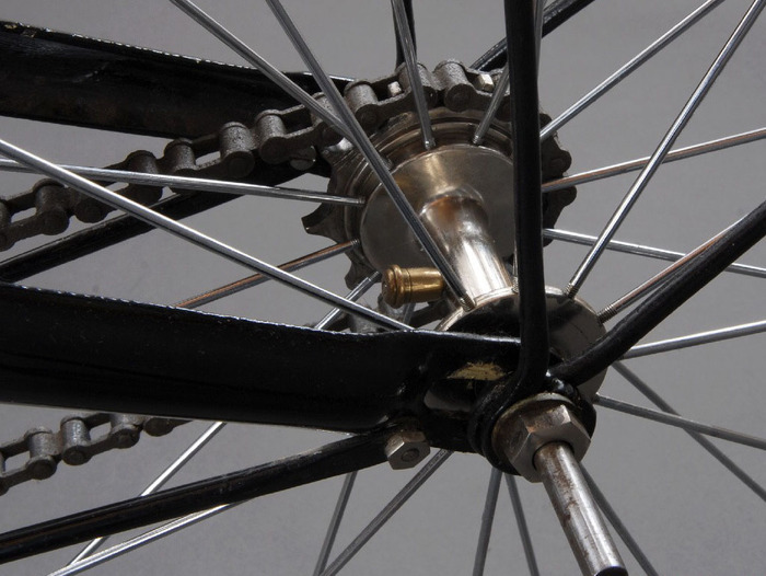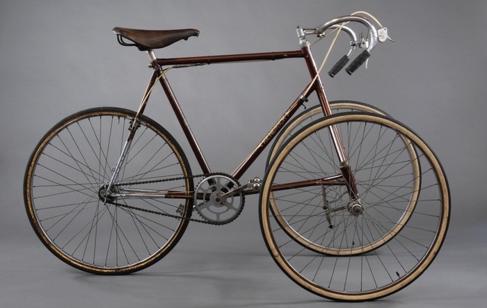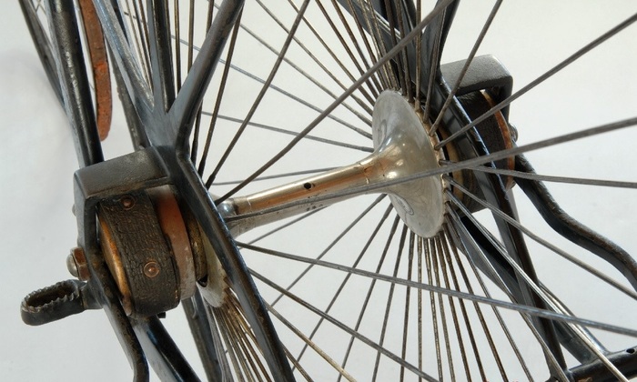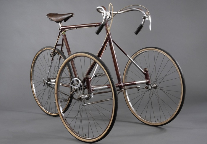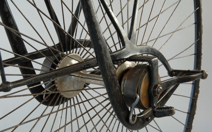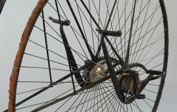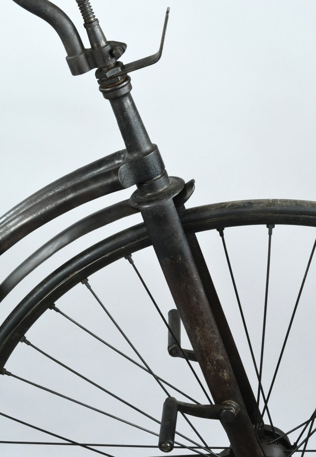 Редкий велосипед American Star производства H. B. Smith Machine Company 1880 года, с рычажным приводом. "Американская звезда" отличался от других обычных велосипедов того времени тем, что большое колесо было смещено назад для лучшей стабильности и повышения безопасности велосипедиста. У велосипеда также было преимущество - на нем можно было ездить очень быстро, так как можно было нажимать на педали обеими ногами одновременно, что было преимуществом при подъеме на холмы и на старте в гонках.