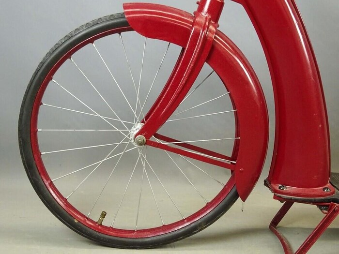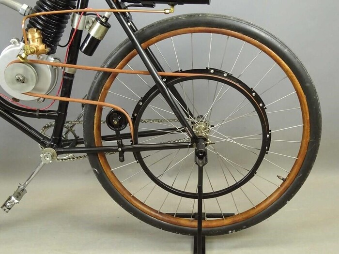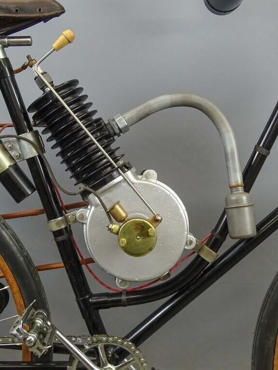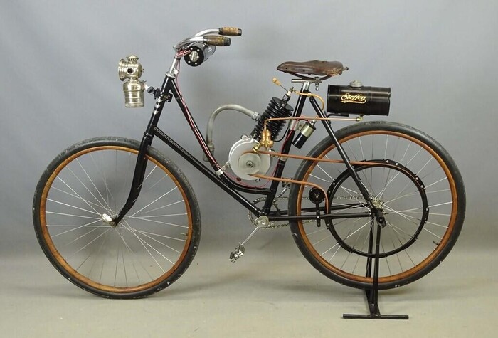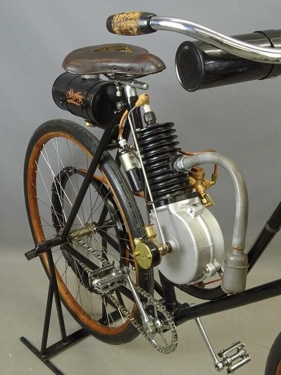 Компания Steffey Manufacturing Co. в Филадельфии производила двигатели и велосипедные комплектующие в начале двадцатого века. Двигатели крепились к велосипедам разной марки. К примеру, к таким, как этот потрясающий экземпляр 1902 года. Велосипед с двигателем был продан 21 октября 2023 года за (30 000 долларов 2.617.000 рублей).