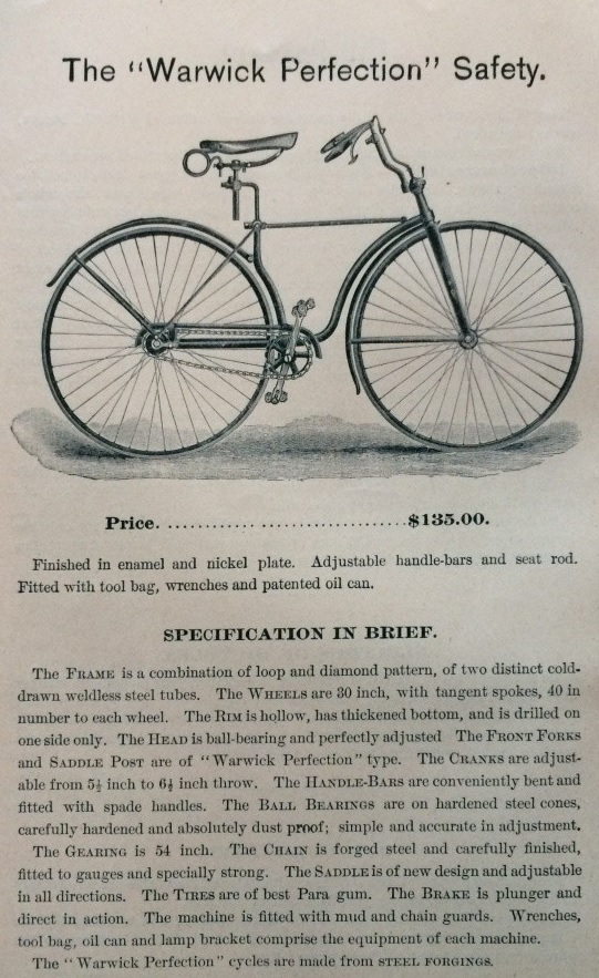 Множество мелких деталей, таких как специальный передний тормоз, запатентованная подвеска седла, специальные обода, защита цепи и кривошипы с 3 различными вариантами регулировки сделали Warwick Perfection особенным велосипедом по специальной цене в 135 долларов, Warwick Perfection Safety в свое время был одним из самых дорогих велосипедов.