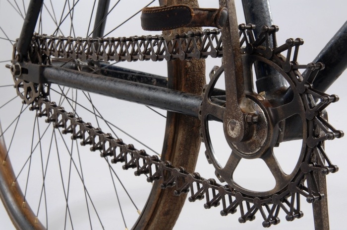 ...In the meantime, technological experiments continued as manufacturers and inventors sought ways to reduce the power necessary to pedal. Such was the object of William Spears Simpson's invention of 1895, the Simpson Lever Chain. The main feature of the chain was its method of engaging the rear chain wheel. The tops of the triangles had cross bars that engaged the perimeter of the rear chain wheel's flange at a much greater distance from the wheel's axis than would an ordinary chain and chain wheel. Thus Simpson could claim that his chain provided more power through greater leverage.