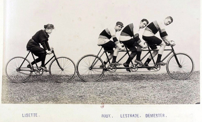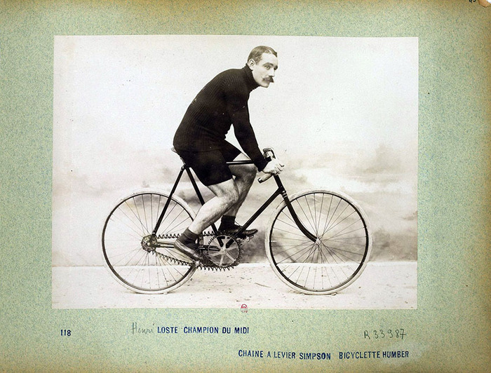 На плакате Лотрека, посвященном велосипедным цепям, изготовленным компанией Simpson company, изображена сцена гонки с участием команд гонщиков на трёх, четырех и пятиместных велосипедах, а также, по крайней мере, одного гонщика, едущего в одиночку; возможно, подразумевается, что цепь Simpson дает одному человеку преимущество над многими. "L.B. Spoke" - так назывался магазин велосипедов, которым управляет представитель Simpson во Франции Луи Бугле.