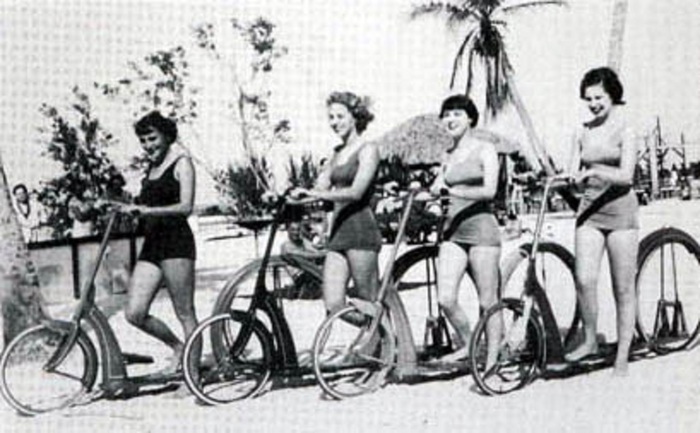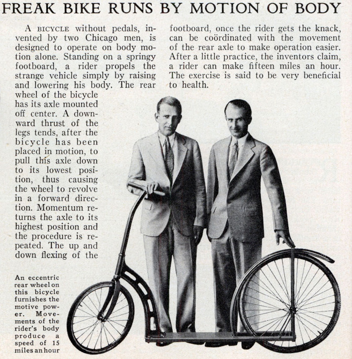 Многие компании, чтобы выжить во время Великой депрессии пробовали новые идеи. В 1934 году компания Borg-Warner, чикагский производитель автозапчастей, переоборудовала часть производственных мощностей своего подразделения Ingersoll-Rand для производства велосипедов нового типа, которые не нуждались в педалях, цепях или передачах. Велосипедист приводил велосипед в движение, дергая за руль и подпрыгивая на платформе. В универмагах велосипед Ingo продавался за 24,95 доллара (сегодня это примерно 426 долларов=37.435 рублей). Велосипед Ingo произвел фурор благодаря появлению в Голливуде, на экране тв, и за его пределами. Многочисленные актеры и актрисы, включая Риту Хейворт, были сфотографированы на велосипедах Ingo, передвигающимися по Голливудской студии. Ingo-Bike даже сыграл эпизодическую роль в фильме “Three Stooges. Yes, We Have No Bonanza”, где Керли подъезжает к салуну "Олд Вест" не на лошади, а на Ingo-Bike. Туристы и жители Нью-Йорка могли взять напрокат велосипеды Ingo и покататься на них в Центральном парке. По всей стране проводились гонки на велосипедах Ingo, в том числе на знаменитой трассе Indianapolis Motor Speedway. К сожалению, инерция велосипеда оказалась небольшой. Постоянное прогибание платформы приводило к появлению трещин, особенно в том месте, где заднее колесо крепилось к платформе. Починить Ingo мог только квалифицированный сварщик. Из-за этого обслуживание Ingo было намного дороже, чем у других велосипедов. К концу 1937 года новые Ingo-байки можно было купить всего за 5 долларов (сегодня это 85 долларов=7435 рублей). Производственные проблемы и низкие продажи заставили Borg-Warner прекратить производство Ingo-Bike в 1937 году.