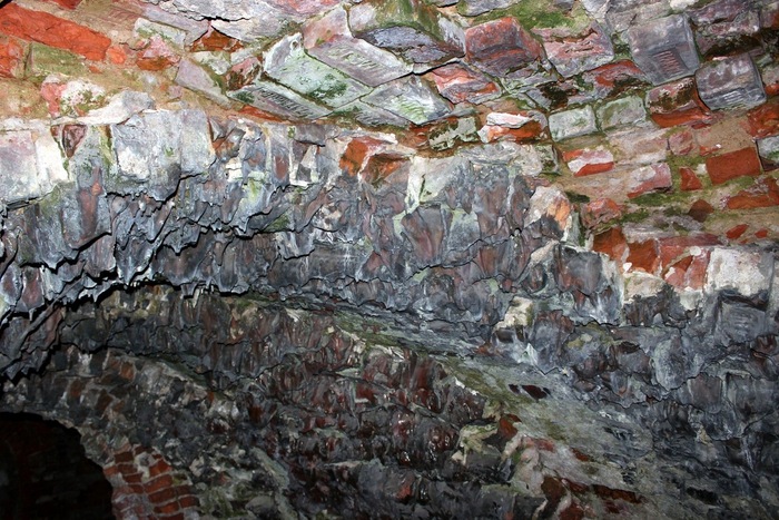 Ниже на фотографии видны следы сильнейшего пожара, который произошел в пороховом погребе. Это какая же была температура, если даже кирпич оплавился? Апокалиптическая картина.