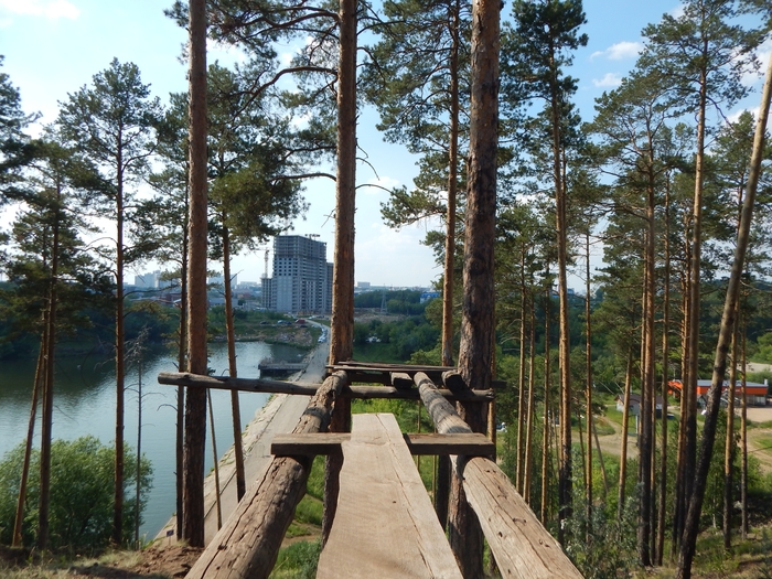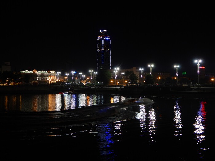 Вид на плотинку и небоскрёб "Высоцкий". Кто-то катается на катере, рассекая водную гладь