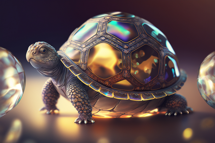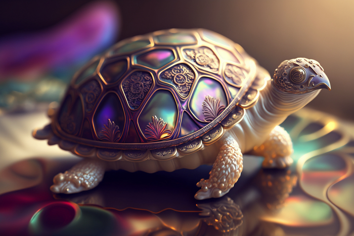 Промпт: Jewelry statuette - a turtle with a silver shell, with opal inlays, on a polished table in a luxurious interior:: Close-up, desktop wallpaper:: a beautiful blurred background, vintage