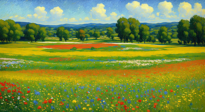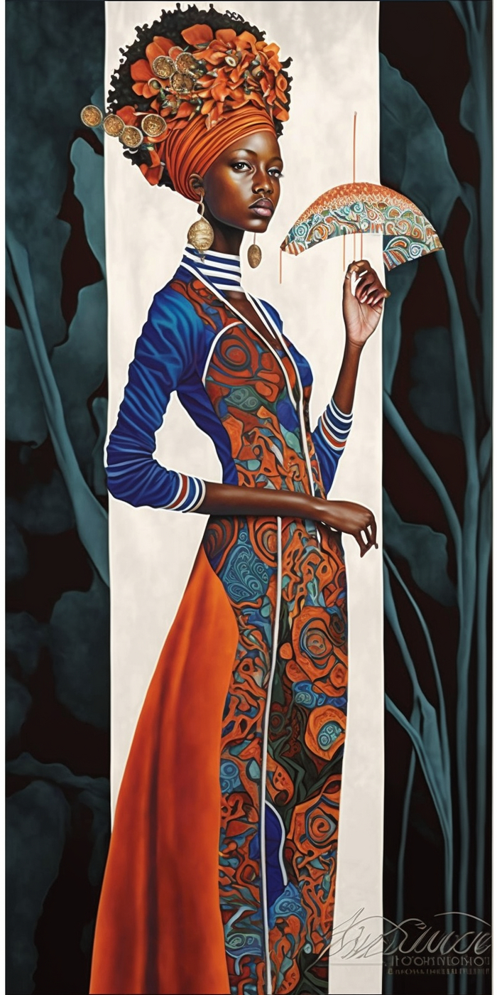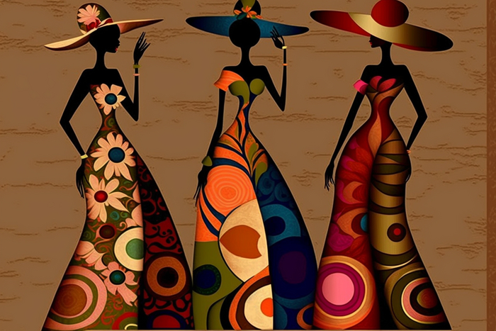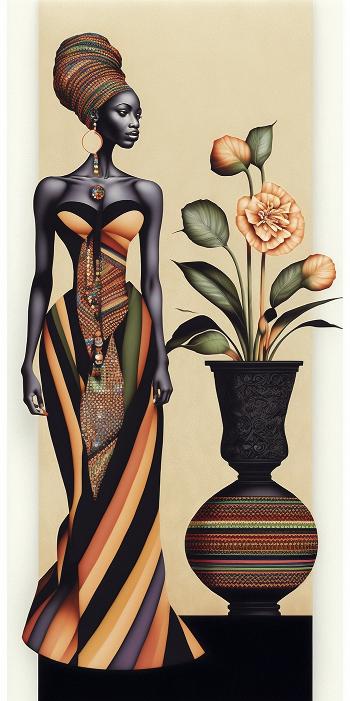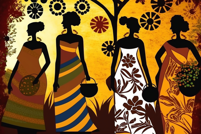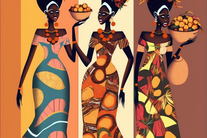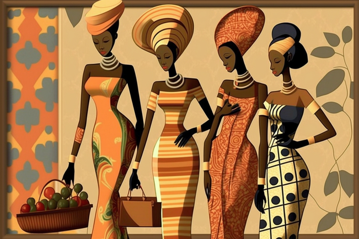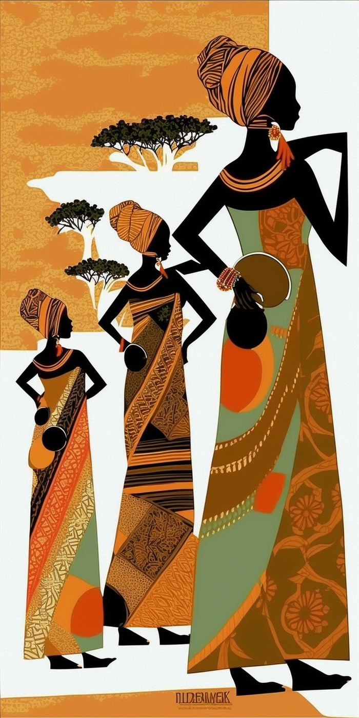 Промпт: African motifs:: Women in long patterned dresses:: Next to flowers and fruit:: Decorative illustration in African style, 2d by Keith Mallett, Heidi Beers