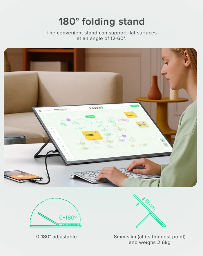 Подключение возможно через мини-HDMI и два порта USB-C 3.1, совместим с ноутбуками, ПК, смартфонами и игровыми консолями. Поддерживает технологию FreeSync для устранения разрывов изображения. Эргономичная конструкция включает крепление VESA и регулируемую подставку с поворотом на 180°. Идеален для геймеров, видеомонтажеров и тех, кому нужен второй экран в поездках или для работы из дома.