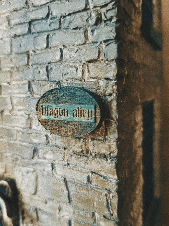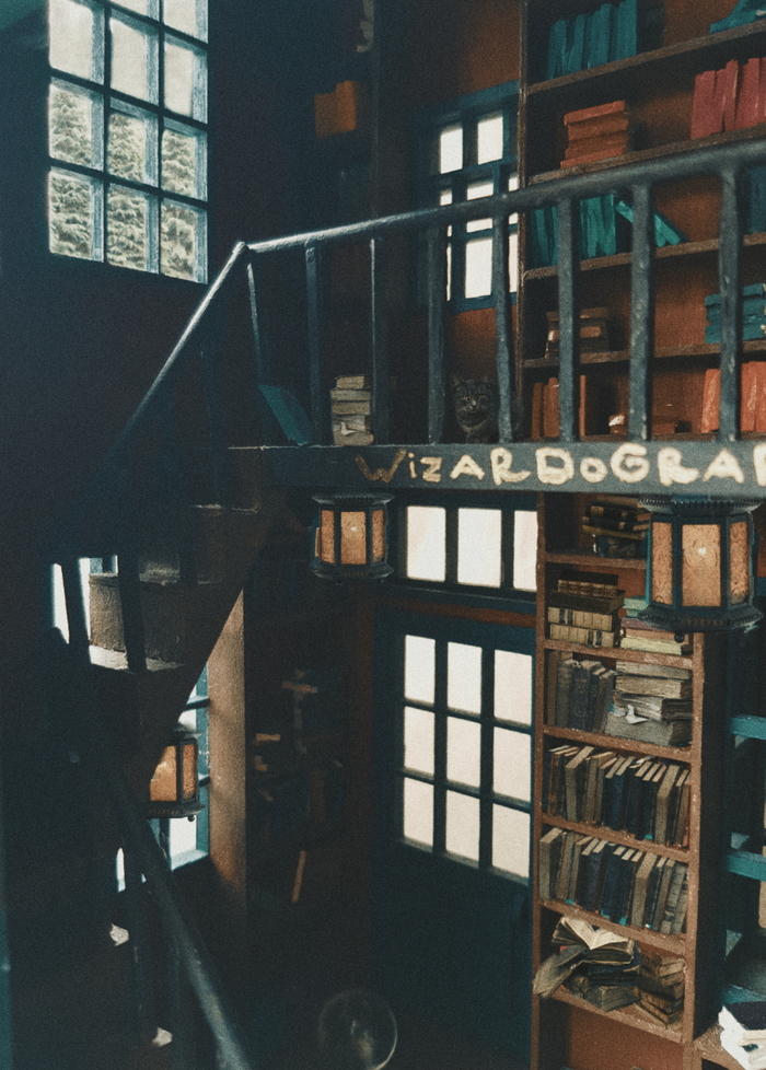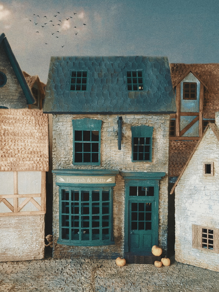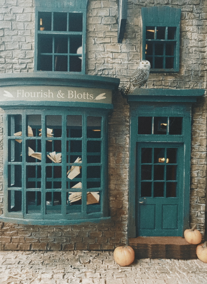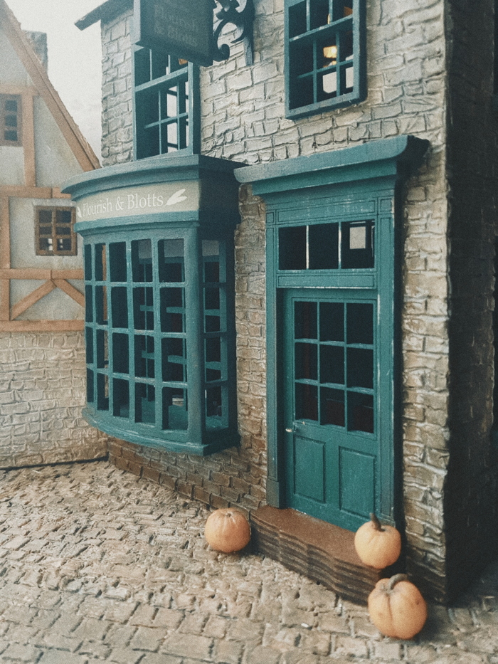 Т.к. это была книжная лавка "Флориш и Блоттс" из мира Гарри Поттера, то и внутри я постаралась передать атмосферу Книжной лавки из фильма: наделала шкафов и кучу книг, поставила лестницу, лампу заменила фонариками.
