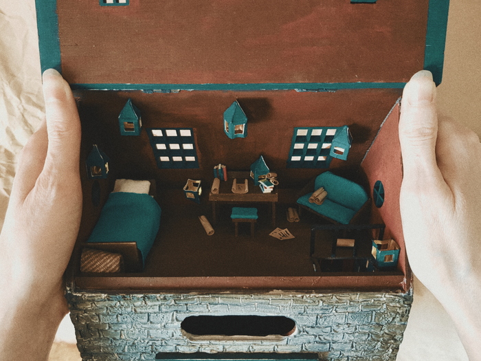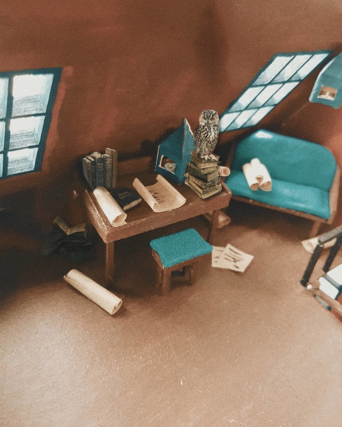 Чердак пришлось тоже облагородить. Сделала небольшую комнатку хозяина книжной. В кроватку спрятала выключатель для гирлянды. Что бы все это увидеть, крышу можно открыть с задней части.