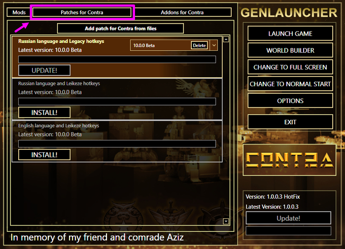 Далее запускаем GenLauncher.exe > вкладка ADD MOD! > вкладка Contra X Beta > добавляем кнопкой ADD! > Install. Ждем установку.