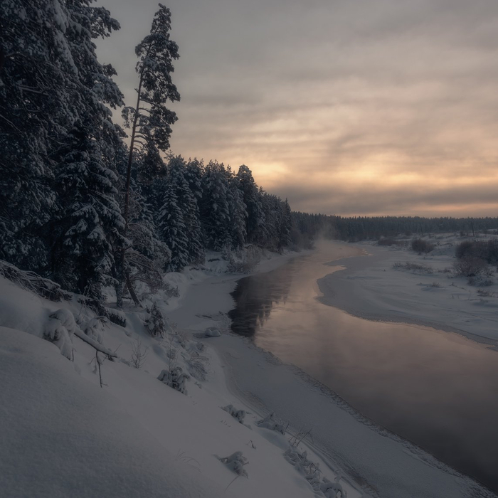 Болота утопают в тумане. Проступают силуэты сосен, они кажутся призрачными, словно миражи. Деревья на горизонте размыты туманной дымкой, их контуры растворяются в воздухе, создавая ощущение бесконечности пространства.