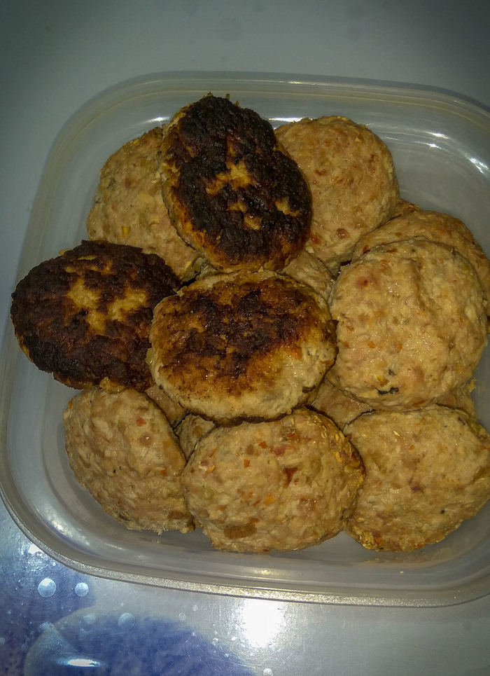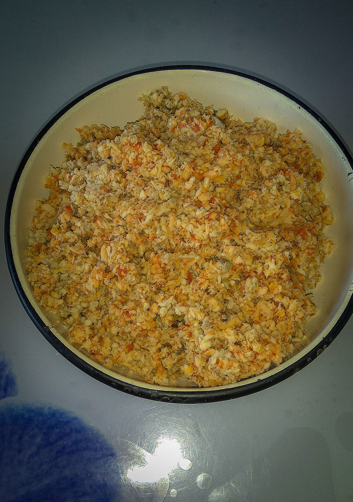 НО! Но я замешиваю в это месиво жирный фарш,обычно свино-говяжий или совсем диетический птичий (курица, индюшка ). Нет мяса? Не беда, можно просто сала перекрутить. Пропорции не скажу, все по вкусу (я 50\50 мешаю). Ну и все, добавляем лучка, что б не так сухо было, соли\перца и жарим\печем