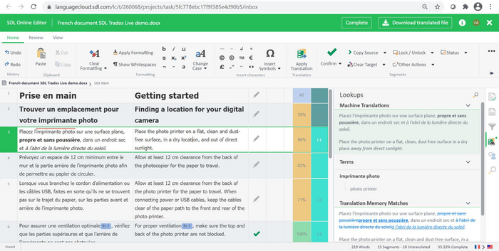 Благодаря подключенному машинному переводу MateCat автоматически подставит перевод в каждый сегмент. Останется только посмотреть каждый сегмент и, при желании, отредактировать неточности. Если MateCat не подставил перевод, нужно пройтись по каждому сегменту и выбрать перевод вручную.