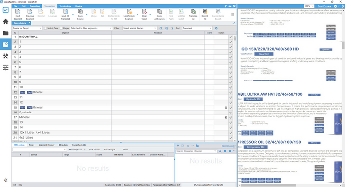 Разобраться в программе немного сложно, если никогда не имели дело с CAT-тулзами. Но путём нехитрых манипуляций всё же можно создать проект, а потом начать переводить. Единственное, я не понял, где все языки. Почему только английский, немецкий и французский? Наверное, потерялись в премиум-версии. Ради теста решил вбить тот же документ про масла, что использовал в статье про OCR-сервисы. В качестве целевого языка выбрал немецкий.