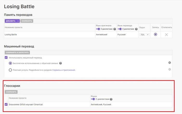 Настройки предварительного перевода и флаг "Использовать машинный перевод"