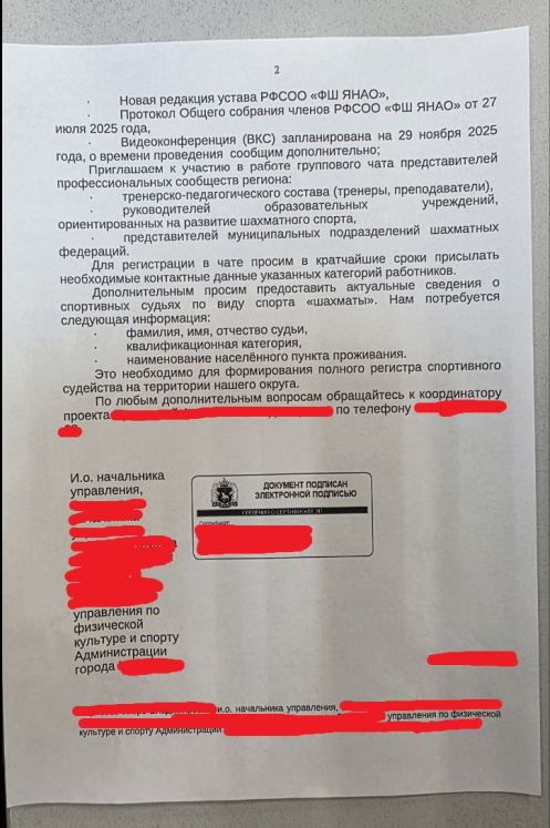 Но самое примечательное произошло уже в конце ноября 2025 года. На официальном бланке Управления по спорту одного из муниципалитетов (в котором на руководящей должности работает избранный президент Новой Федерации) по всем Управлениям по спорту Ямала было разослано письмо, подписанное электронной подписью. В нём уведомлялось, что региональная общественная организация «Федерация шахмат ЯНАО» планирует, среди прочего, провести видеоконференцию и приглашает принять в ней участие.