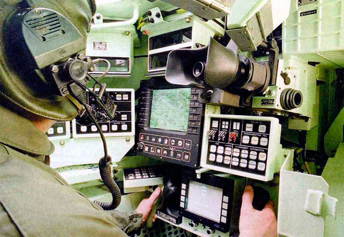 Танк имеет систему управления огнём Bofors Aerotronics и цифровой баллистический вычислитель. Командир танка и водитель-наводчик имеют идентичные перископические бинокулярные приборы с изменяемой кратностью от 6 до 18, используемые для наблюдения, поиска целей и наведения орудия. Прибор командира может поворачиваться вместе с командирской башенкой, прибор наводчика зафиксирован по продольной оси машины. В прицел наводчика встроен лазерный дальномер «Симрад». Командирский прибор стабилизирован в вертикальной плоскости, а его башенка в горизонтальной. Оптические приборы на танке прикрыты броневыми заслонками. При обнаружении цели командир может передать целеуказание наводчику в автоматическом режиме. В силу специфической компоновки механик-водитель является фактически и наводчиком. Рабочее место командира оборудовано, помимо приборов наблюдения/прицеливания, собственными приводами управления, при необходимости он может брать функции механика-водителя на себя, осуществляя, таким образом, самостоятельное наведение оружия и поражение цели. Strv.103 является единственной в своём роде машиной на которой боевое применение в полной мере может осуществлять один человек. Третий член экипажа — радист, расположенный лицом к корме, также имеет дублирующие органы управления движением и может при необходимости брать управление на себя. Благодаря этому скорость танка при движении задним ходом в сравнимых условиях равна скорости прямолинейного движения вперёд.