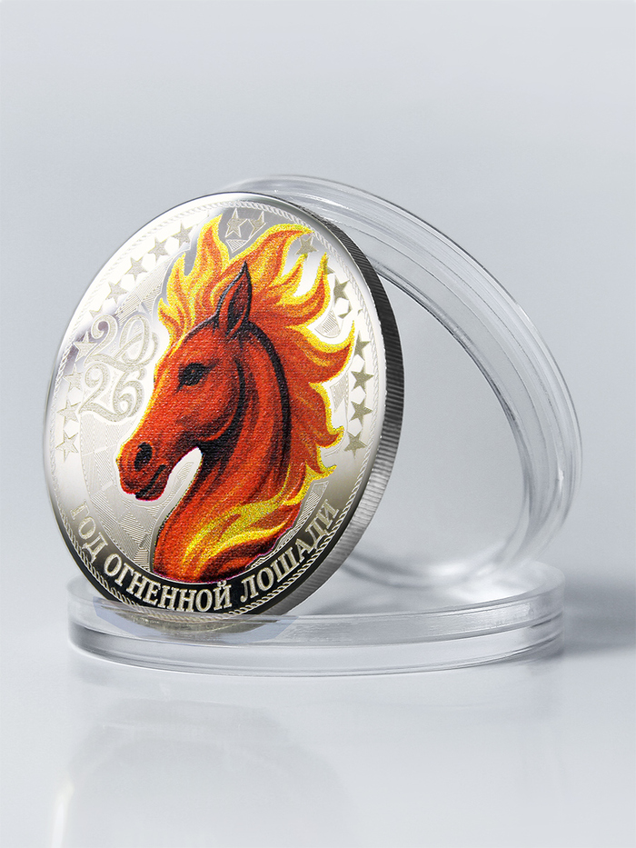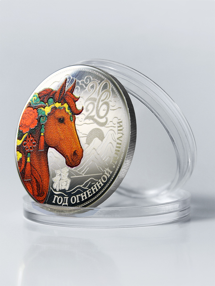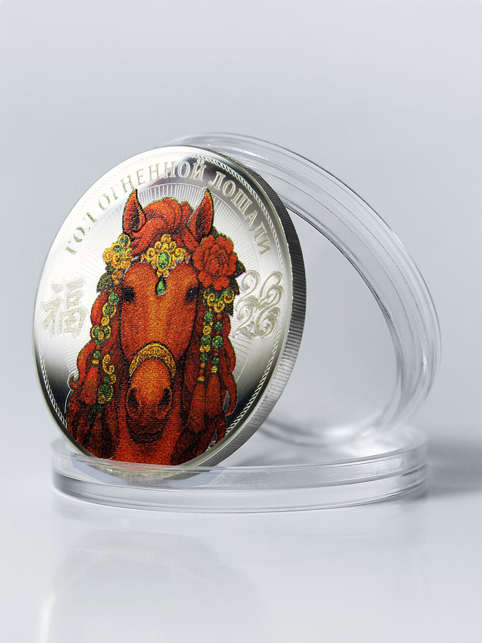 Огненная Лошадь в китайской традиции — знак смелости, лидерства и стремления вперёд. Она приносит удачу, успех и помогает верить в собственные силы. На монете выгравирован иероглиф счастья. Камелии в гриве лошади символизируют верность и внутреннюю гармонию. Вместе все эти знаки создают талисман удачи, силы и счастья.